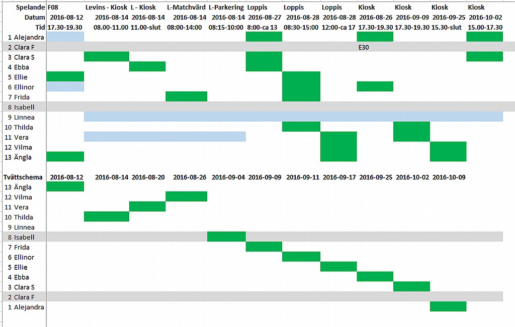 Nu har vi satt upp schema för hösten. Alla kioskpass (om jag inte missat något) finns med, tvättschemat finns längst ner och loppisen är inlagd. Är det något som inte passar får ni först och främst lösa det mellan er och försöka byta. Går inte det får ni höra av er till Sanny, 0733-443756. Schemat lämnas även på matchen på lördag.