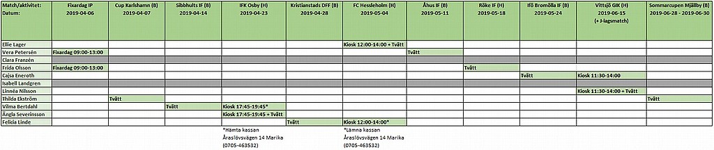 Har lagt ett tvätt- och kioskschema för vårens matcher. Som vanligt får ni försöka att byta med annan förälder om tiderna inte skulle passa.