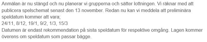 Här kommer vilka helger vi kommer spela, lördag el söndag återkommer jag med när vi har bokat det med motståndarna.